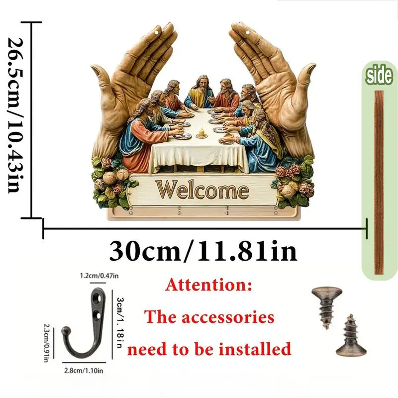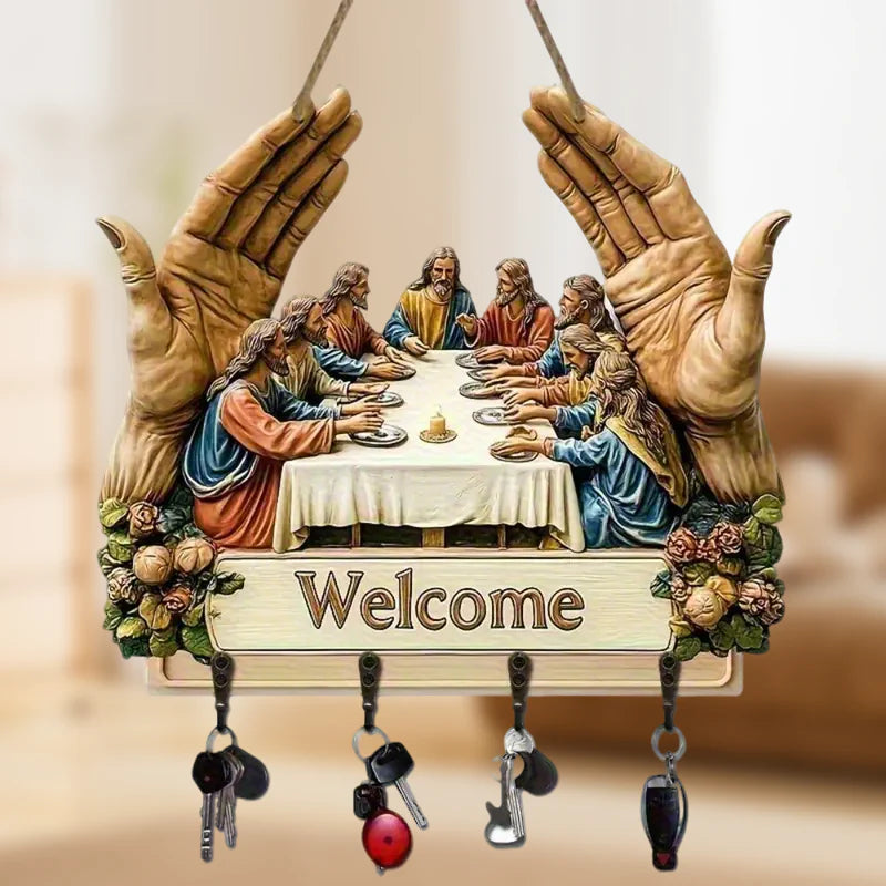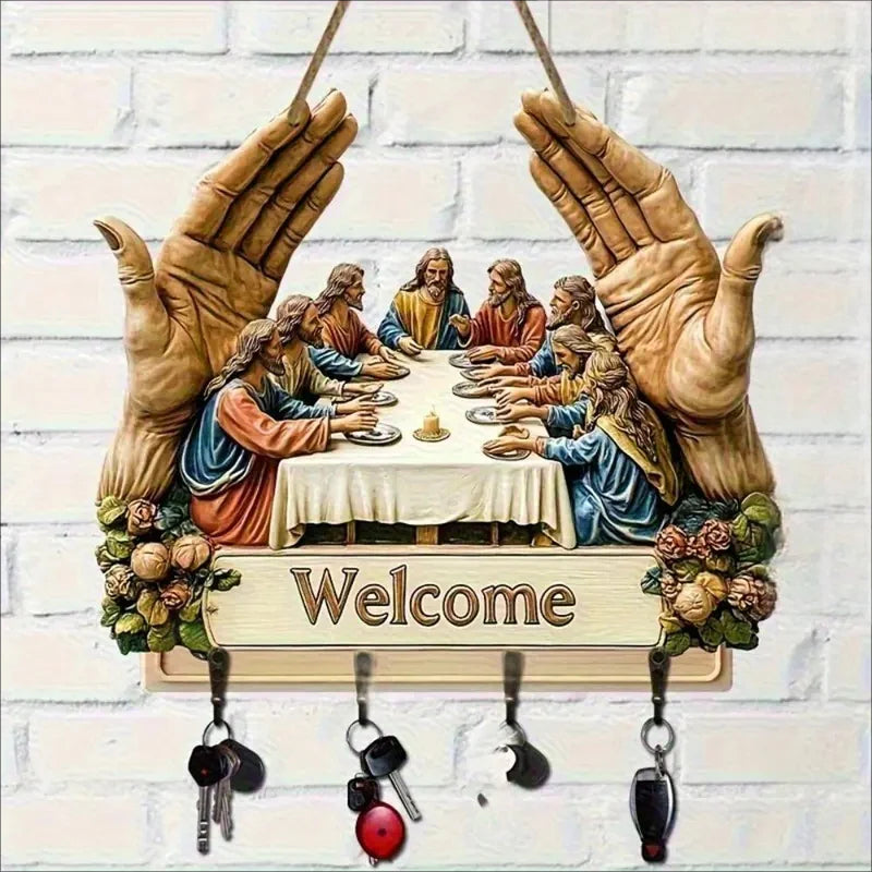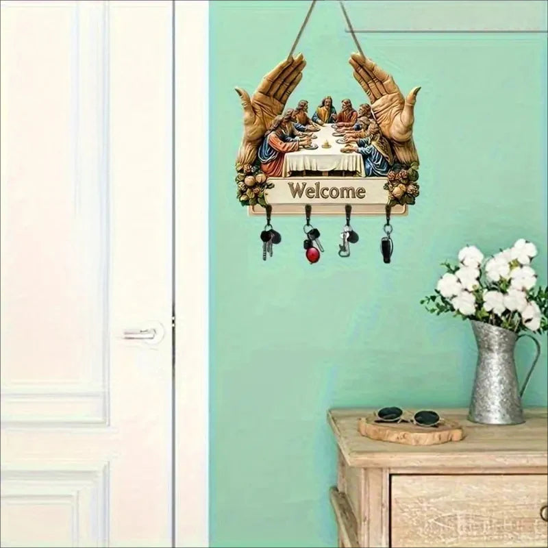 KLASICKÝ UMELECKÝ DIZAJN: Tento drevený držiak na kľúče s ikonickým motívom „Posledná večera“ obohacuje interiéry o nadčasovú krásu. Jeho umelecká potlač dodáva eleganciu a zároveň spája dekoratívnosť s funkčnosťou, čím premieňa jednoduchý nástenný doplnok na zmysluplné umelecké dielo do domácnosti.
