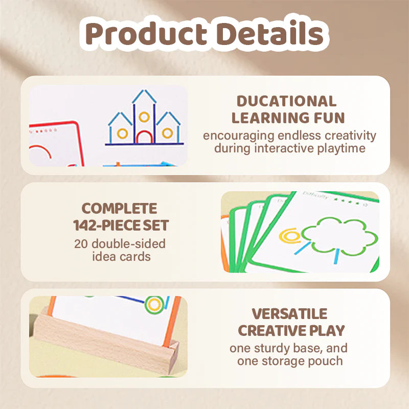 KOMPLETNÁ SADA SO 142 DIELAMI: Obsahuje 120 tyčiniek a kruhov, 20 obojstranných kartičiek s nápadmi, jeden pevný podstavec a jedno úložné vrecko. Všetko, čo potrebujete na začatie kreatívnych vzdelávacích aktivít, je prakticky zabalené v jednej sade.